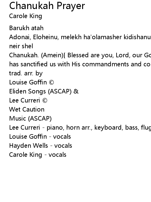 | Chanukah. (Amein)[ Blessed are you, Lord, our God, sovereign of the universeWho has sanctified us with His commandments and commanded usto light the lights of Chanukkah. (Amen) ]trad. arr. by | |