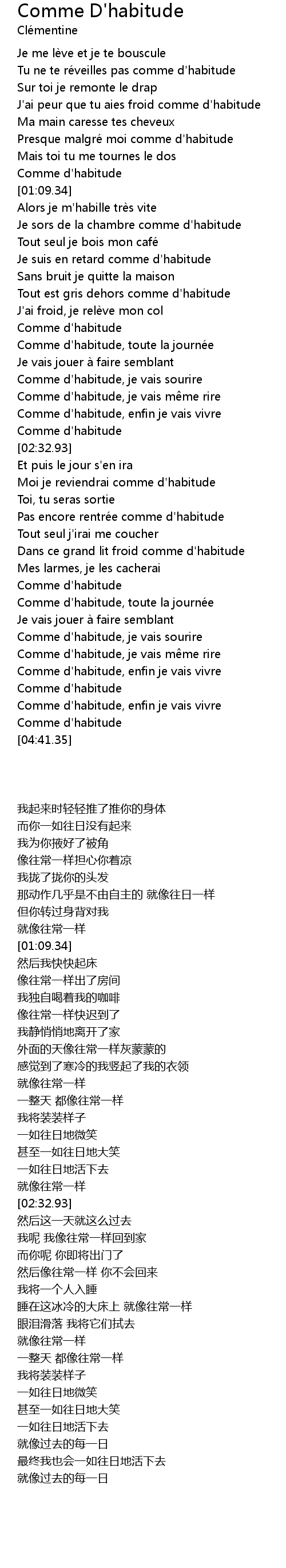 | [02:00.09] | Comme d' habitude, toute la journé e |