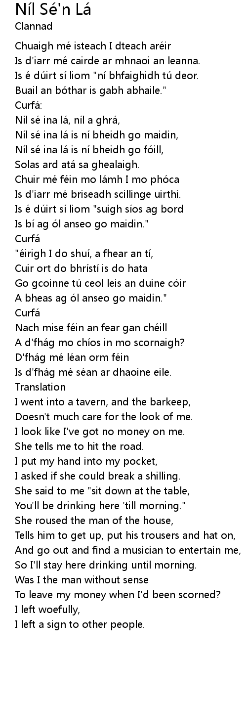| Níl sé ina lá is ní bheidh go fóill, | |