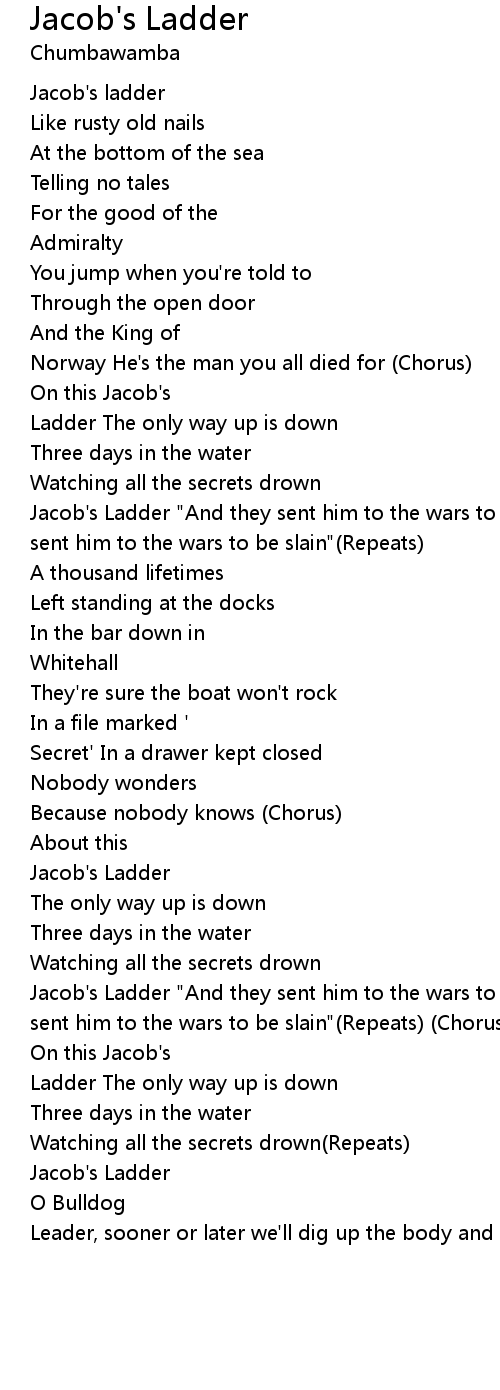 Jacob's Ladder "And they sent him to the wars to be slain, to be slain And they sent him to the wars to be slain"(Repeats) (Chorus) |