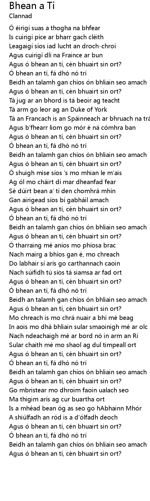 | Agus ó bhean an tí, cén bhuairt sin ort? | |