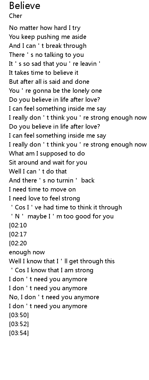 | [01:54][02:10][02:54][03:07][03:23][03:37] | Oh, do you believe in life after love? |