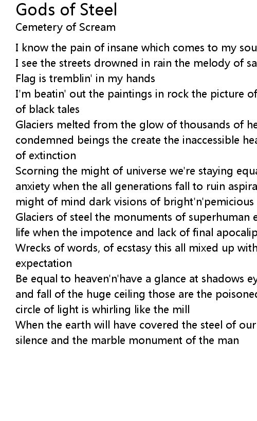 Scorning the might of universe we're staying equal gods to feel the shudder of anxiety when the all generations fall to ruin aspiration for eternity for the might of mind dark visions of bright'n'pemicious tombs