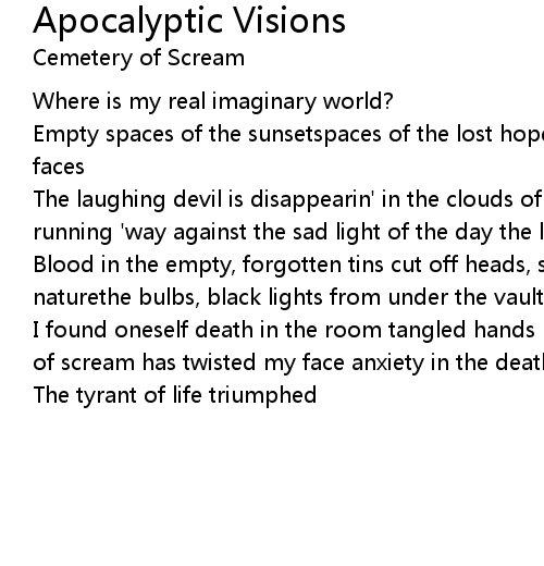 Blood in the empty, forgotten tins cut off heads, strange creations of the naturethe bulbs, black lights from under the vault acrid teste of blood in mouth |