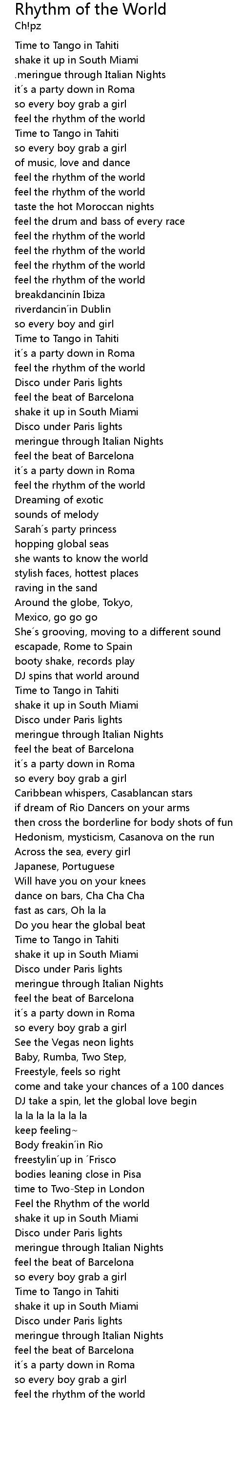 | [02:21.500] | DJ take a spin, let the global love begin |