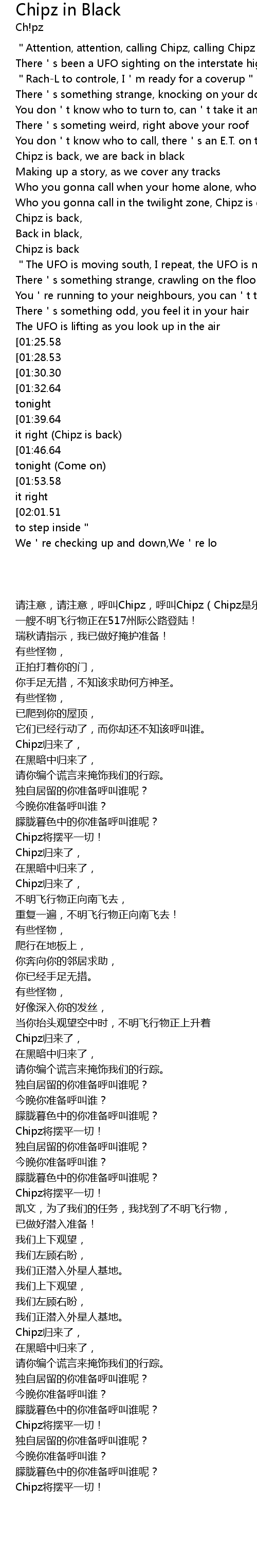 | [02:36.61][01:39.64] | Who you gonna call in the twilight zone, Chipz is gonna make it right Chipz is back |