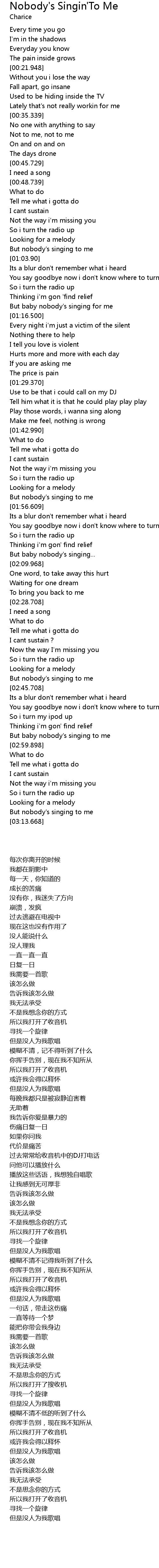| [01:13.788] | But baby nobody's singing for me |