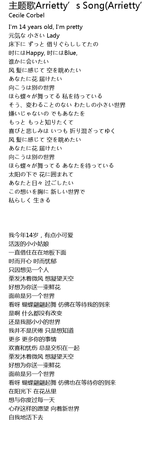 | Song | 主题歌Arrietty’s Song(Arrietty’s Song) |