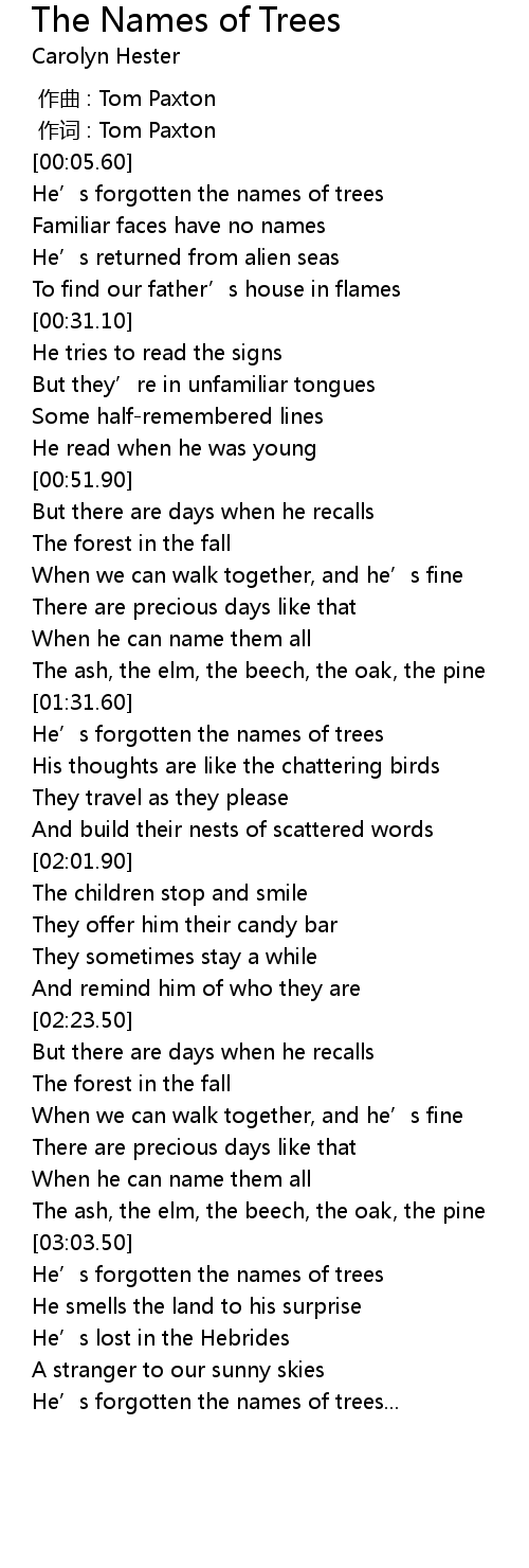 | [02:53.50] | The ash, the elm, the beech, the oak, the pine |