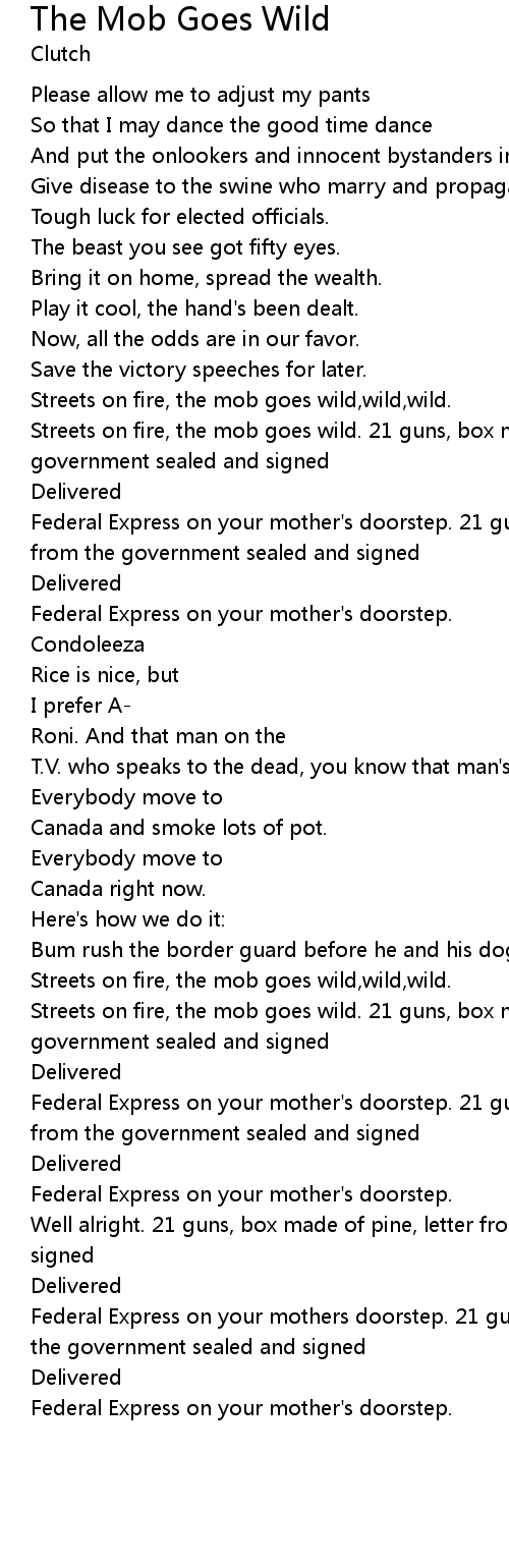 Streets on fire, the mob goes wild. 21 guns, box made of pine, letter from the government sealed and signed |