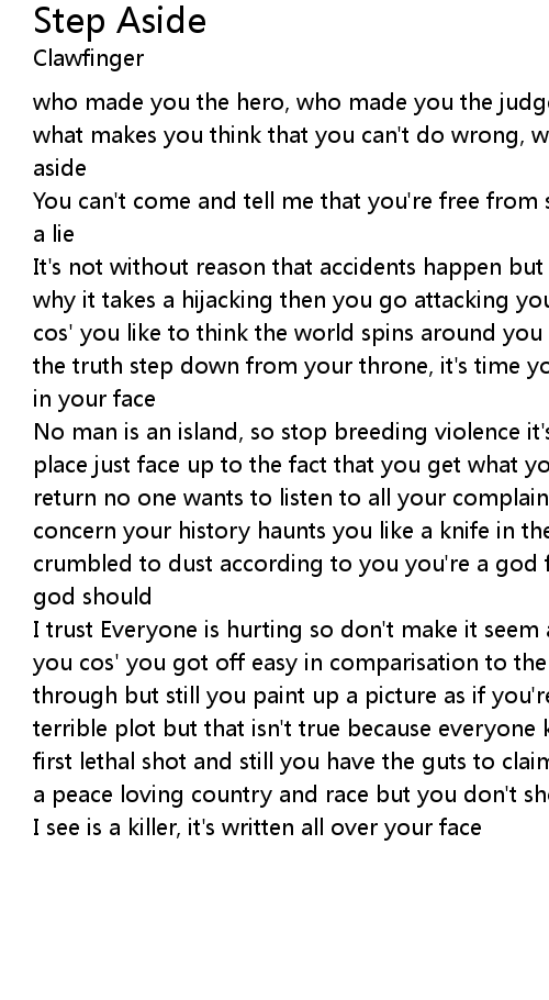 No man is an island, so stop breeding violence it's neither the time or the place just face up to the fact that you get what you give so expect a payback in return no one wants to listen to all your complaining your problems are not our concern your history haunts you like a knife in the back, your dreams have all crumbled to dust according to you you're a god fearing man but who's version of god should |