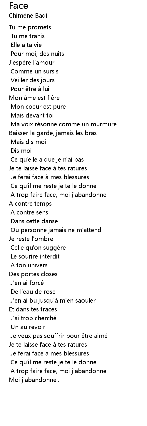 | A trop faire face, moi j' abandonne | |