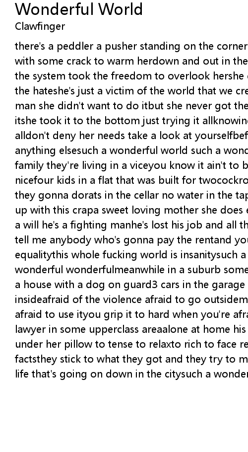 there's a peddler a pusher standing on the cornerthere's a junky on the street with some crack to warm herdown and out in the city she's working as a hookerso the system took the freedom to overlook hershe don't exist that's made her feel the hateshe's just a victim of the world that we createshe didn't have a chance man she didn't want to do itbut she never got the choice so she just said screw itshe took it to the bottom just trying it allknowing that nobody even cared at alldon't deny her needs take a look at yourselfbefore you start talking 'bout anything elsesuch a wonderful world such a wonderful worldthere's a lower class family they're living in a viceyou know it ain't to bad but it sure ain't nicefour kids in a flat that was built for twocockroaches on the floor so what they gonna dorats in the cellar no water in the tapthe kids of today are growing up with this crapa sweet loving mother she does everything she cana father with a will he's a fighting manhe's lost his job and all the money's been spentso tell me anybody who's gonna pay the rentand you're all talking 'bout equalitythis whole fucking world is insanitysuch a wonderful world..... wonderful wonderfulmeanwhile in a suburb some fancy boulevardthere's a couple in a house with a dog on guard3 cars in the garage they keep everything insideafraid of the violence afraid to go outsidemoney ain't funny if you're afraid to use ityou grip it to hard when you're afraid to loose itworking as a lawyer in some upperclass areaalone at home his wife goes into hysteriaa gun under her pillow to tense to relaxto rich to face reality to scared to face the factsthey stick to what they got and they try to make it prettyhiding from the life that's going on down in the citysuch a wonderful world..... |