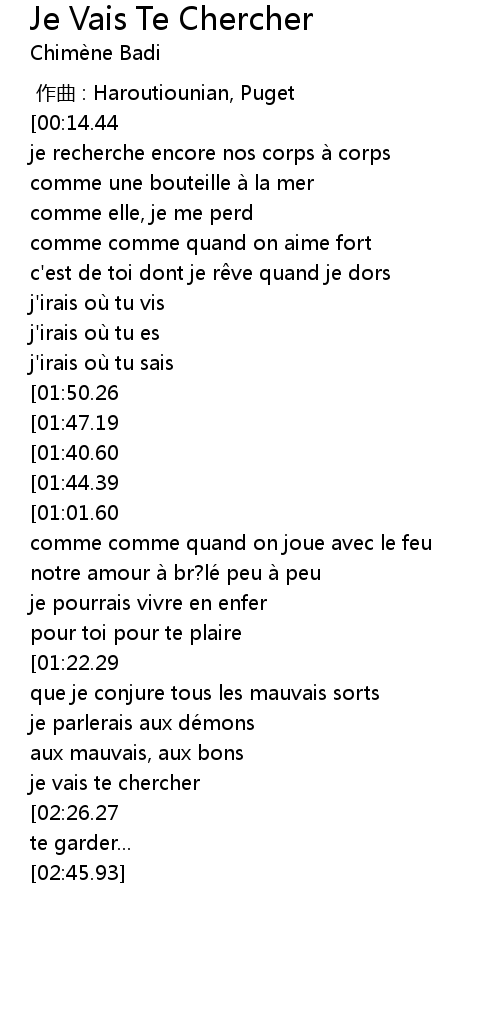 | [02:02.07][01:50.26][01:34.45][00:58.60][00:43.01] | je vais te chercher partout |