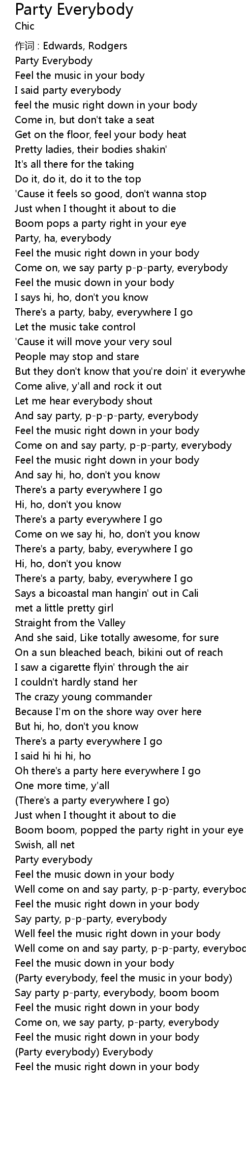 | (Party everybody, feel the music in your body) | |