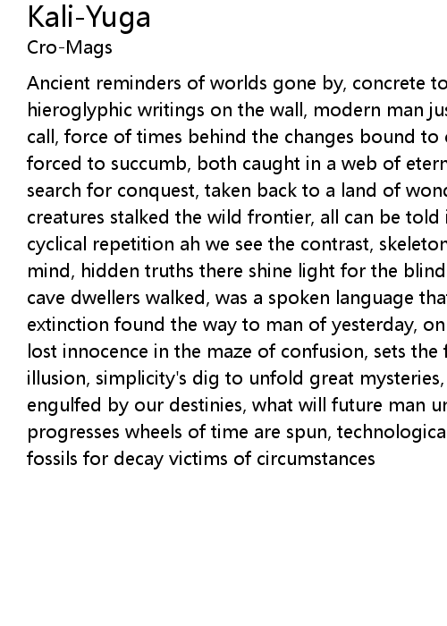 Ancient reminders of worlds gone by, concrete tombstones reach for the sky, like hieroglyphic writings on the wall, modern man just doesn't seem to hear his call, force of times behind the changes bound to come, primitive man was once forced to succumb, both caught in a web of eternal quest, wiped out by their search for conquest, taken back to a land of wonder and of fear, prehistoric creatures stalked the wild frontier, all can be told in unlocking of the past, cyclical repetition ah we see the contrast, skeletons in a closet as dark as the mind, hidden truths there shine light for the blind, somewhere back in time when cave dwellers walked, was a spoken language that needed not be talked, extinction found the way to man of yesterday, only to occurr in tragedies today, lost innocence in the maze of confusion, sets the final stage for this drama of illusion, simplicity's dig to unfold great mysteries, as we plunge forward engulfed by our destinies, what will future man uncover in our ruin, Kali-Yuga progresses wheels of time are spun, technological society buried by ignorance, fossils for decay victims of circumstances |
