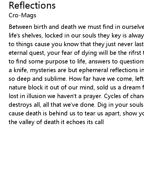 Between birth and death we must find in ourselves, keepers of secrets stored on life's shelves, locked in our souls they key is always the past, don't hold on to things cause you know that they just never last, somewhere in time your eternal quest, your fear of dying will be the rifrst test, looking for meaning to find some purpose to life, answers to questions that tear at your heart like a knife, mysteries are but ephemeral reflections in time, oceans of wisdom run so deep and sublime. How far have we come, left so much behind, escaping your nature block it out of our mind, sold us a dream full of pain and despair, so lost in illusion we haven't a prayer. Cycles of change surely to come, as time destroys all, all that we've done. Dig in your souls reflect in your hearts, cause death is behind us to tear us apart, show you no mercy, no mercy at all, the valley of death it echoes its call |