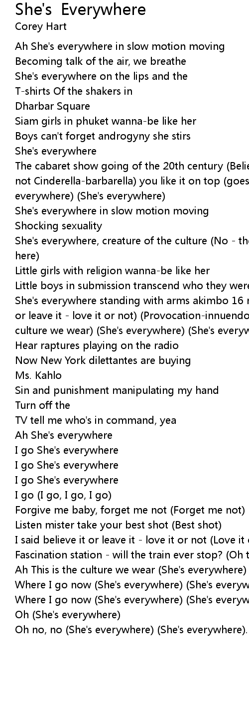 She's everywhere standing with arms akimbo 16 minutes of celebrity (Believe it or leave it - love it or not) (Provocation-innuendo, baby says hot) (goes the culture we wear) (She's everywhere) (She's everywhere) |