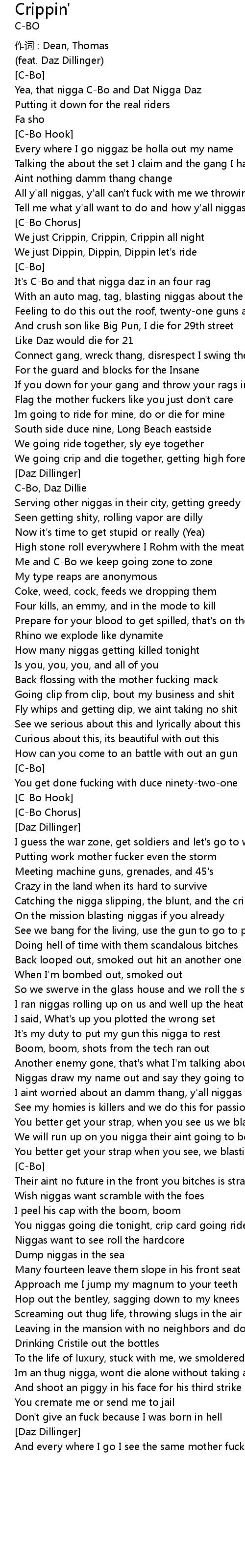 | Catching the nigga slipping, the blunt, and the crippin | |