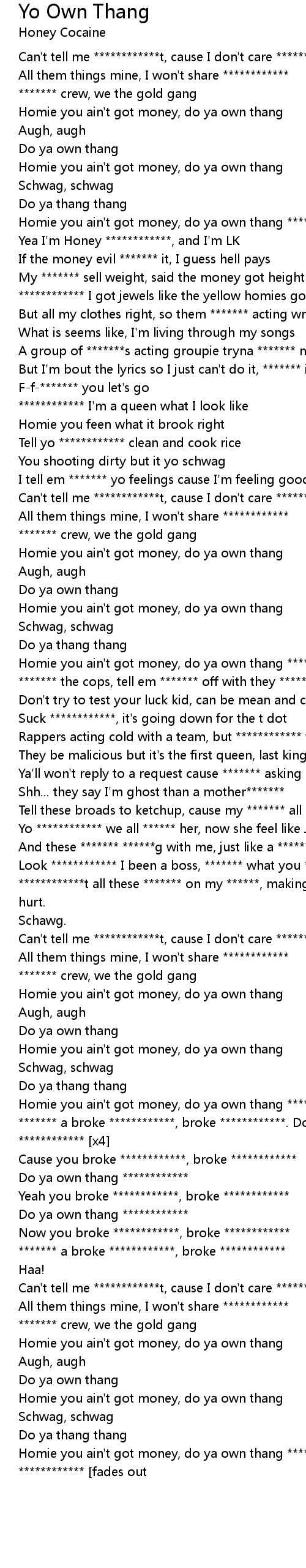 | [02:29.60]******* a broke ************, broke ************. Do ya own thang ************ [x4] |