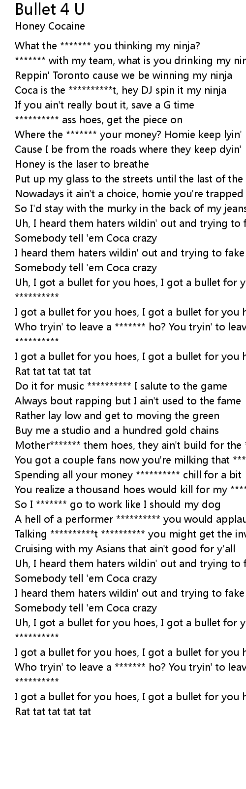 Uh, I got a bullet for you hoes, I got a bullet for you hoes, ********** |