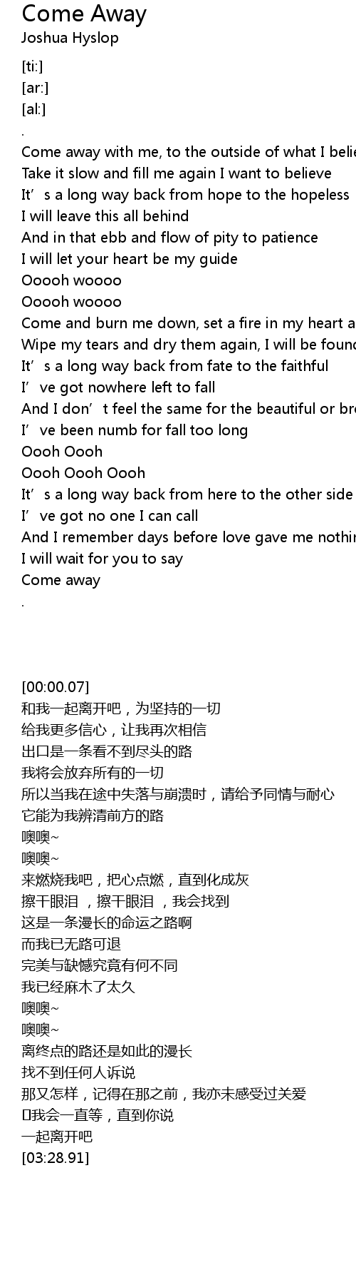 | [00:15.25] | Come away with me, to the outside of what I believe |