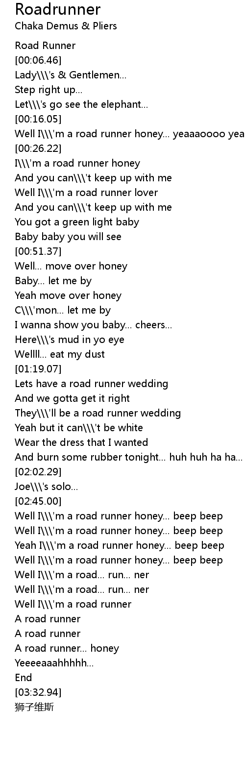 | [02:55.12] | Yeah I\\\'m a road runner honey... beep beep |