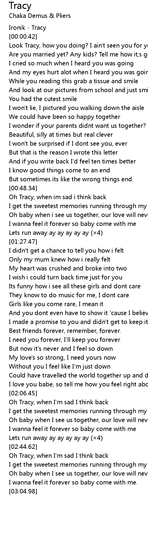 | [00:48.62] | Oh Tracy, when im sad i think back |