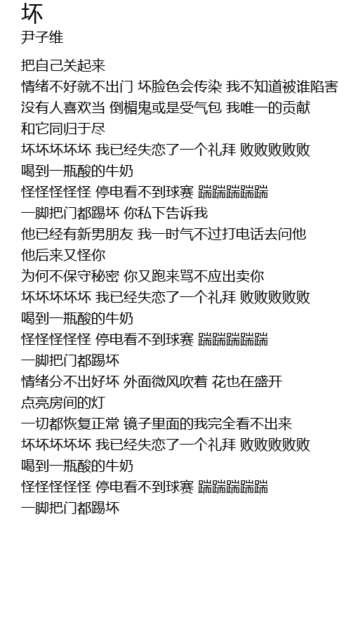 | [02:56.79] | 坏坏坏坏坏 我已经失恋了一个礼拜 败败败败败 |