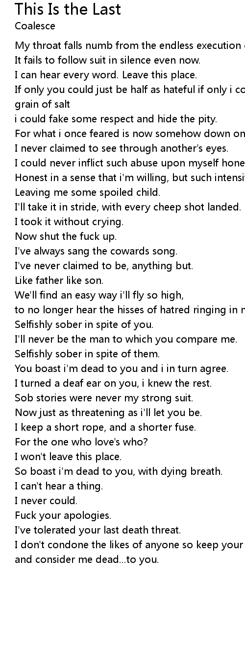 My throat falls numb from the endless execution of contempt's song. |