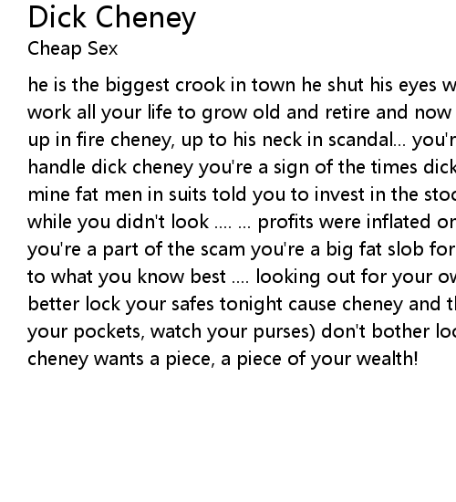 he is the biggest crook in town he shut his eyes when the scandals were found work all your life to grow old and retire and now you're life savings just went up in fire cheney, up to his neck in scandal... you're too ... out of control to handle dick cheney you're a sign of the times dick cheney you're not a friend of mine fat men in suits told you to invest in the stocks and collect interest then while you didn't look .... ... profits were inflated on the books dick cheney you're a part of the scam you're a big fat slob for good ol' uncle sam stickin' to what you know best .... looking out for your own interests! [Chorus (x2)] better lock your safes tonight cause cheney and the boys are out tonight! (watch your pockets, watch your purses) don't bother looking out for yourselves cause cheney wants a piece, a piece of your wealth! |