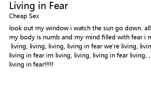 | look out my window i watch the sun go down. all day and night no one is around my body is numb and my mind filled with fear i never thought the war would come here! [Chorus:] living, living, living, living in fear we're living, living, living in fear im living, living, living in fear living, , living, living, living in fear!!!!! |