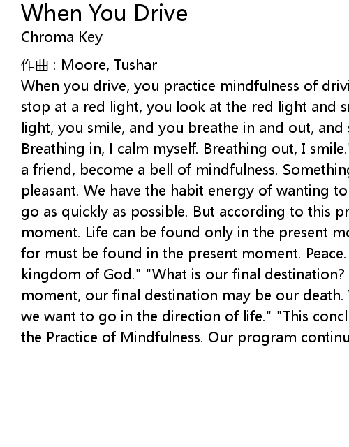 | When you drive, you practice mindfulness of driving. It is possible. When you stop at a red light, you look at the red light and smile. You look at the red light, you smile, and you breathe in and out, and sit back, relaxingly. Breathing in, I calm myself. Breathing out, I smile." "And the red light become a friend, become a bell of mindfulness. Something unpleasant become something pleasant. We have the habit energy of wanting to arrive. That is why we want to go as quickly as possible. But according to this practice, we arrive at every moment. Life can be found only in the present moment. Everything that we look for must be found in the present moment. Peace. Joy. Happiness. Buddha. The kingdom of God." "What is our final destination? If we abandon the present moment, our final destination may be our death. We don't want to arrive there, we want to go in the direction of life." "This concludes Tape 1, A Retreat on the Practice of Mindfulness. Our program continues with Tape 2. |
