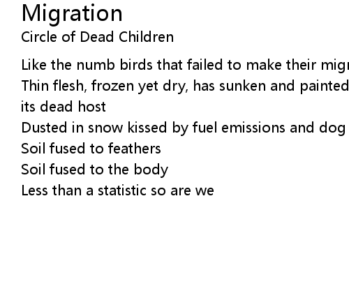 | Thin flesh, frozen yet dry, has sunken and painted itself to the filthy bones of its dead host | |