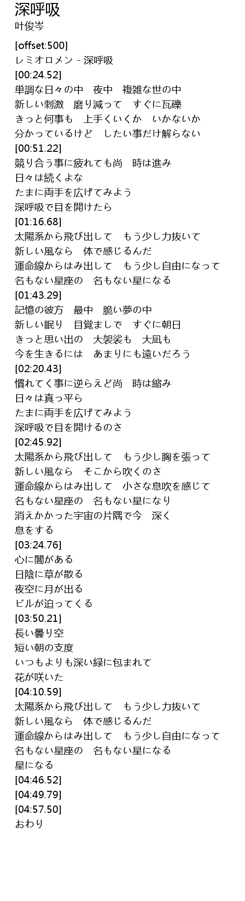| [00:00.00] | レミオロメン - 深呼吸 |