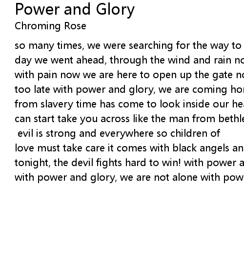 so many times, we were searching for the way to the land, where we can live one day we went ahead, through the wind and rain no longer will our hearts be filled with pain now we are here to open up the gate now we are here, for you it's not too late with power and glory, we are coming home with power and glory, escape from slavery time has come to look inside our hearts the gate is open now, so we can start take you across like the man from bethlehem and with the sign of victory we will follow him [chorus] evil is strong and everywhere so children of love must take care it comes with black angels and tempts you to sin be careful tonight, the devil fights hard to win! with power and glory, we are coming home with power and glory, we are not alone with power and glory, escape from slavery