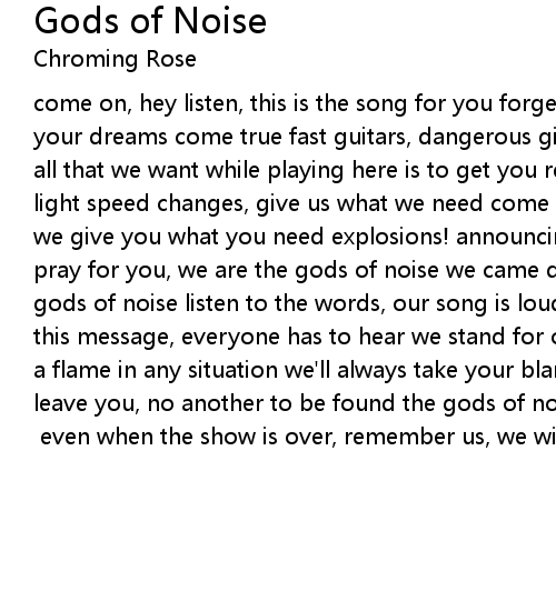 come on, hey listen, this is the song for you forget your daily shit, may all your dreams come true fast guitars, dangerous girls, we'll have a party tonight all that we want while playing here is to get you really tight maxi wattage, light speed changes, give us what we need come closer to the stage, our friends, we give you what you need explosions! announcing our arrival! we came down to pray for you, we are the gods of noise we came down to pray for you, we are the gods of noise listen to the words, our song is loud and clear go out and spread this message, everyone has to hear we stand for our music, that's spreading like a flame in any situation we'll always take your blame and when your good friends leave you, no another to be found the gods of noise appear and lift you off the ground [chorus] even when the show is over, remember us, we will return! |