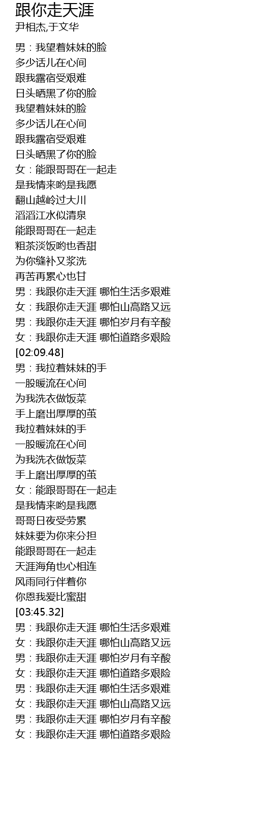 | [03:45.87] | 男:我跟你走天涯 哪怕生活多艰难 |
