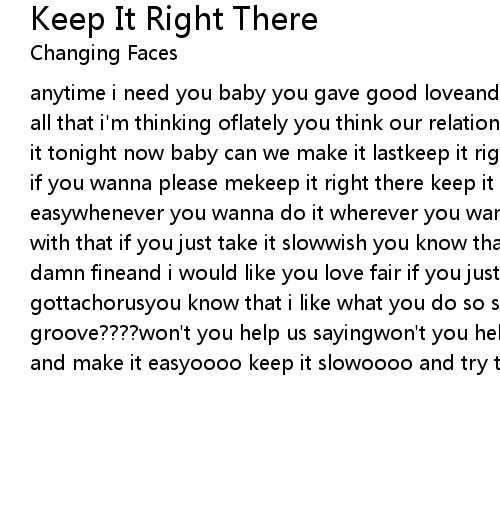 anytime i need you baby you gave good loveand every time i turn around you're all that i'm thinking oflately you think our relation going too fastcan we try it tonight now baby can we make it lastkeep it right there keep it right there if you wanna please mekeep it right there keep it right there and i'll make it easywhenever you wanna do it wherever you wanna goi know that i can get right with that if you just take it slowwish you know that everything you do is so damn fineand i would like you love fair if you just take your timeso you gottachorusyou know that i like what you do so slow downand catch this groove????won't you help us sayingwon't you help me say ooooooo keep it slowoooo and make it easyoooo keep it slowoooo and try to please me