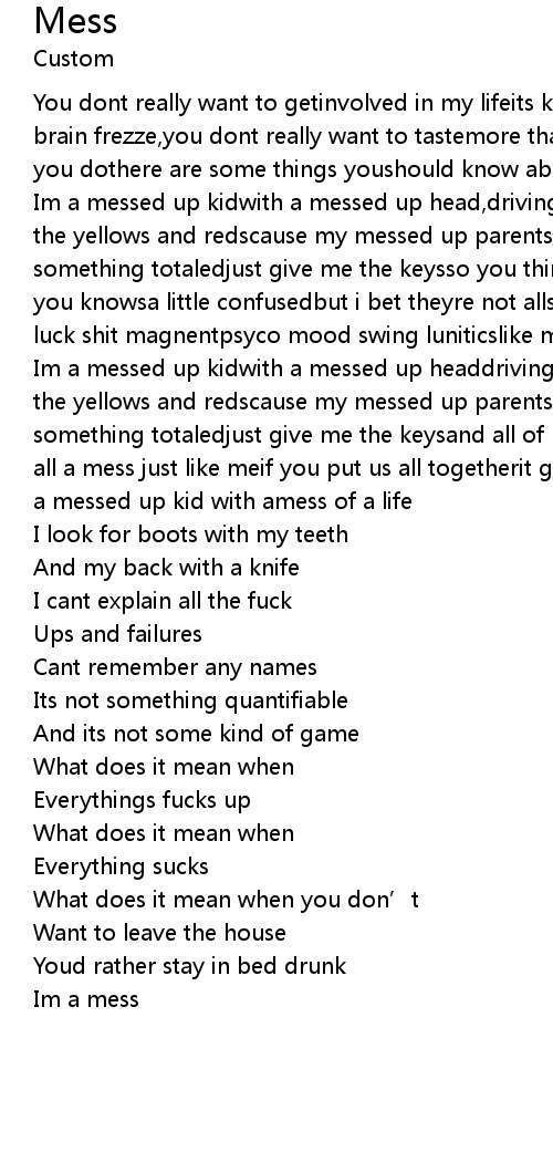 | Im a messed up kidwith a messed up headdriving this wreck of a lifethrough all the yellows and redscause my messed up parentsmessed up and had meif you want something totaledjust give me the keysand all of my friends are all a messtheyre all a mess just like meif you put us all togetherit gets really uglyim a messim a messed up kid with amess of a life | |