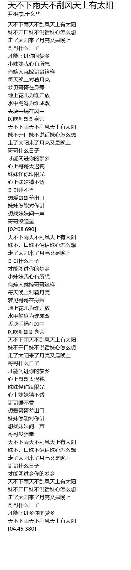 | [04:05.790] | tiān bù xià yǔ tiān bù guā fēng tiān shàng yǒu tài yáng |