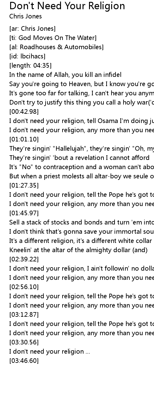 I don't need your religion, tell the Pope he's got to stop his cryin' |
