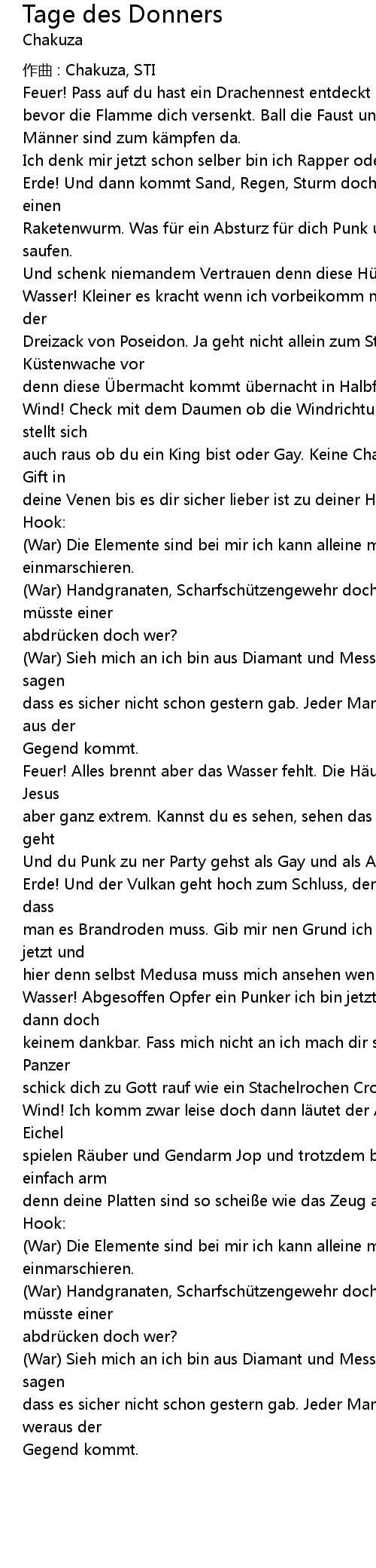 | War Die Elemente sind bei mir ich kann alleine mit dem Mic ü ber die Grenze einmarschieren. | |
