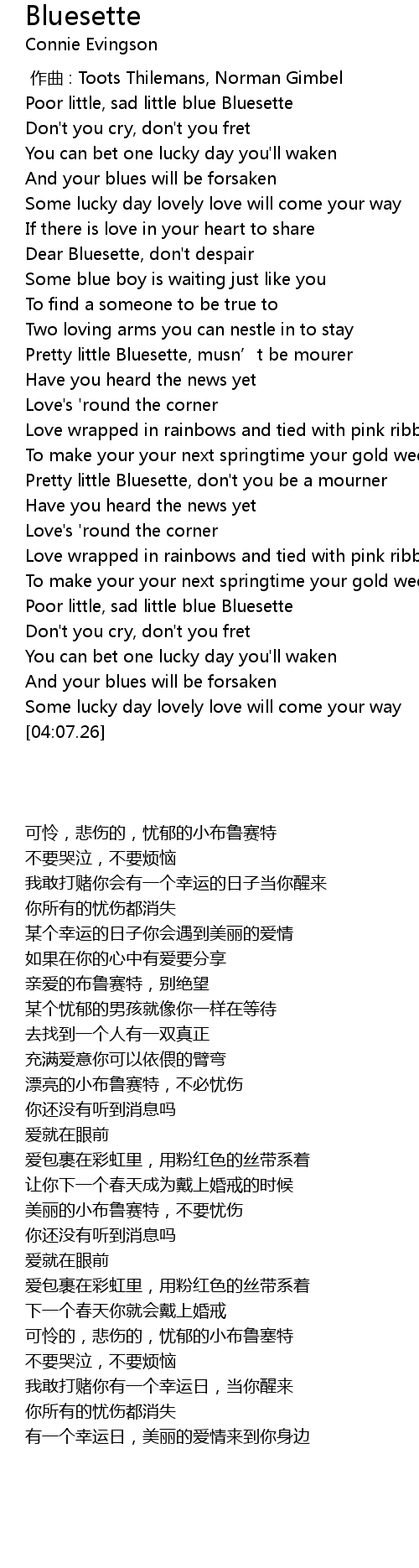 | [01:29.35] | Pretty little Bluesette, musn’t be mourer |