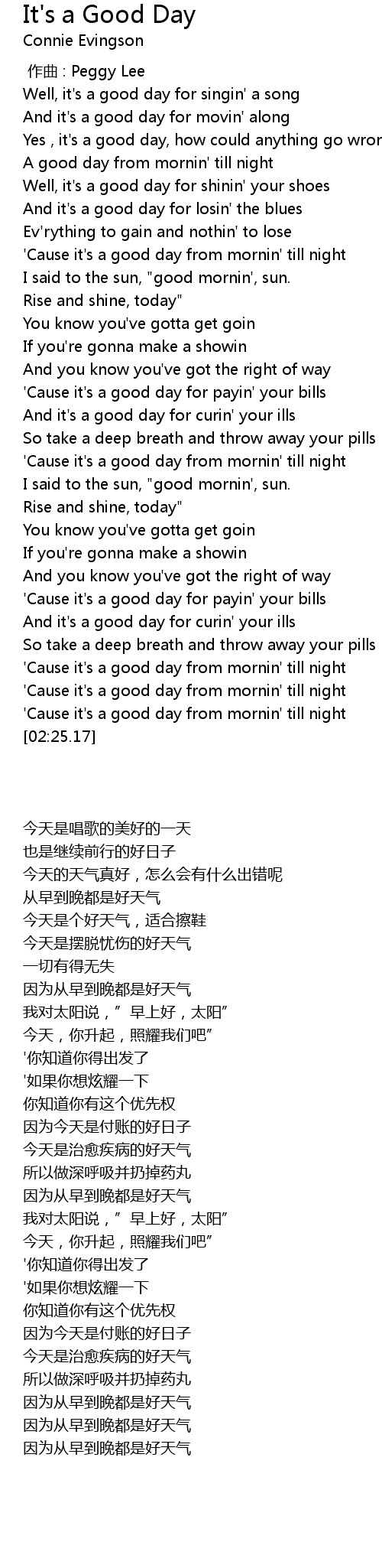 | [02:21.99] | ' Cause it' s a good day from mornin' till night |