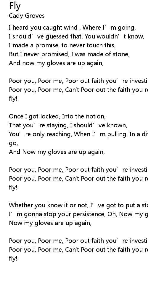 | Poor you, Poor me, Poor out faith you' re investing, Baby, I, Got to fly, | |