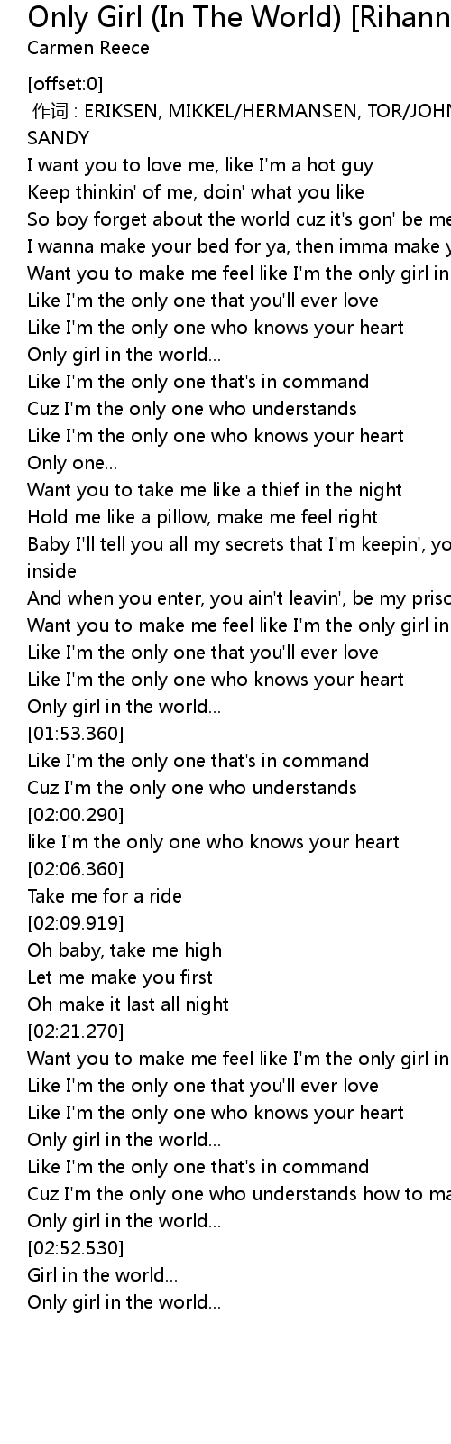 | [01:37.289] | Want you to make me feel like I' m the only girl in the world |