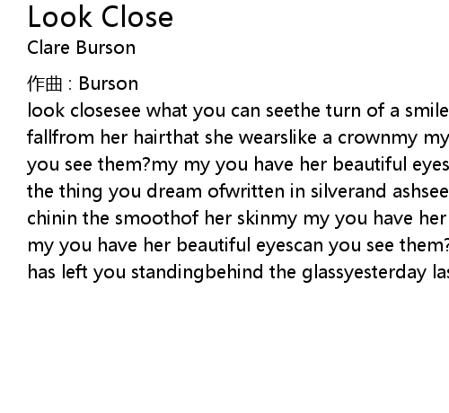 | look closesee what you can seethe turn of a smileon her facethe shadows that fallfrom her hairthat she wearslike a crownmy my you have her beautiful eyescan you see them?my my you have her beautiful eyescan you see them?look closethere's the thing you dream ofwritten in silverand ashsee how it hidesin the shapeof her chinin the smoothof her skinmy my you have her beautiful eyescan you see them?my my you have her beautiful eyescan you see them?i can see themi canlook closetime has left you standingbehind the glassyesterday lastsforever |
