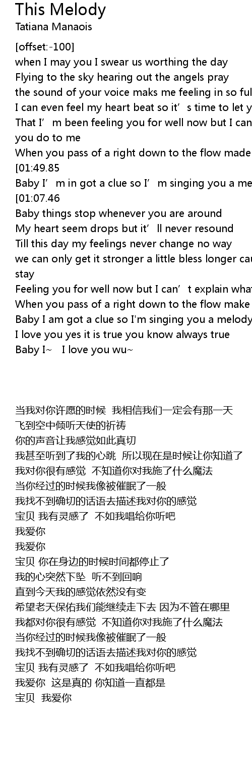 | [00:50.36] | Baby I' m in got a clue so I' m singing you a melody |