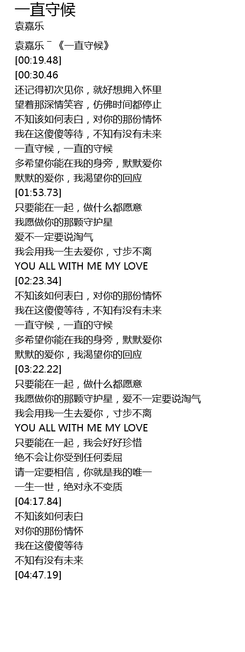 | [00:03.49] | 袁嘉乐 ― 《一直守候》 |